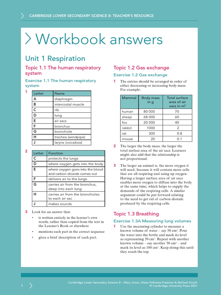 Workbook Answers: Unit 1 Respiration