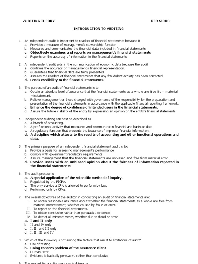 1. An independent audit is important to readers of financial statements because it a. Provides a measure of management's stewardship function b. Measures and communicates the financial data included in financial statements c. Objectively examines and reports on management's financial statements d. Reports on the accuracy of information in the financial statements 2. An independent audit aids in the communication of economic data because the audit a. Confirms the accuracy of management's financial representation. b. Guarantees that financial data are fairly presented. c. Assures the readers of financial statements that any fraudulent activity has been corrected. d. Lends credibility to the financial statements. 3. The purpose of an audit of financial statements is to a. Obtain an absolute level of assurance that the financial statements as a whole are free from material misstatement. b. Relieve management or those charged with governance of the responsibility for the preparation and presentation of the financial statements in accordance with the applicable financial reporting framework. c. Enhance the degree of confidence of intended users in the financial statements. d. Assure the future viability of the entity by expressing an opinion on the entity's financial statements. 4. Independent auditing can best be described as a. A branch of accounting. b. A professional activity that measures and communicates financial and business data. c. A regulatory function that prevents the issuance of improper financial information. d. A discipline which attests to the results of accounting and other functional operations and data. 5. The primary purpose of an independent financial statement audit is to: a. Provide a basis for assessing management's performance b. Comply with government regulatory requirements c. Assure management that the financial statements are unbiased and free from material error d. Provide users with an unbiased opinion about the fairness of information reported in the financial statements 6. The audit process is a. A special application of the scientific method of inquiry. b. Regulated by the PICPA. c. The only service a CPA is allowed to perform by law. d. Performed only by CPAs. 7. The overall objectives of the auditor in conducting an audit of financial statements are: I. To obtain reasonable assurance about whether the financial statements as a whole are free from material misstatement, whether caused by fraud or error. II. To report on the financial statements. III. To obtain conclusive rather than persuasive evidence IV. To detect all misstatements, whether due to fraud or error a. I and II only b. II and IV only c. I, II, and III only d. I, II, III and IV 8. Which of the following is not among the factors that result to limitations of audit? a. Use of testing b. Going concern problem of the assurance client c. Human error d. Evidence is basically persuasive rather than conclusive 9. The market for auditing services is driven by a. The regulatory authority of the Securities and Exchange Commission. b. A demand by external users of financial statements. c. Pronouncements issued by the Auditing and Assurance Standards Council.