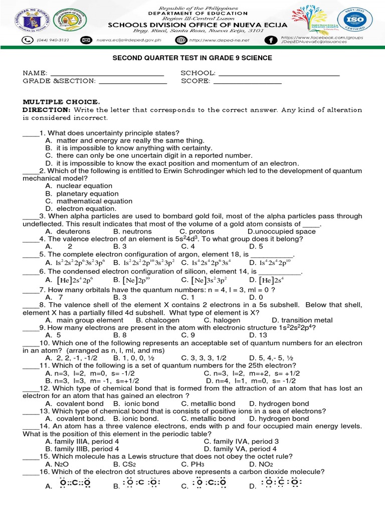 Second Quarter Test With Answer in Grade 9 Science